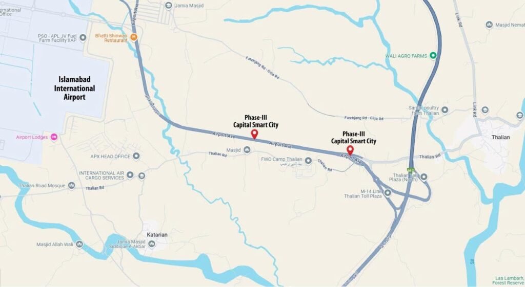 Capital Smart City Phase 3 enjoys a prime location along Airport Avenue, adjacent to the Thalian Interchange, making it one of the most prestigious and accessible projects in Islamabad and Rawalpindi. Nestled between two major landmarks—Islamabad International Airport and the Thalian Toll Plaza (M-14)—this development offers a high-value setting ideal for residential, commercial, and investment opportunities.
